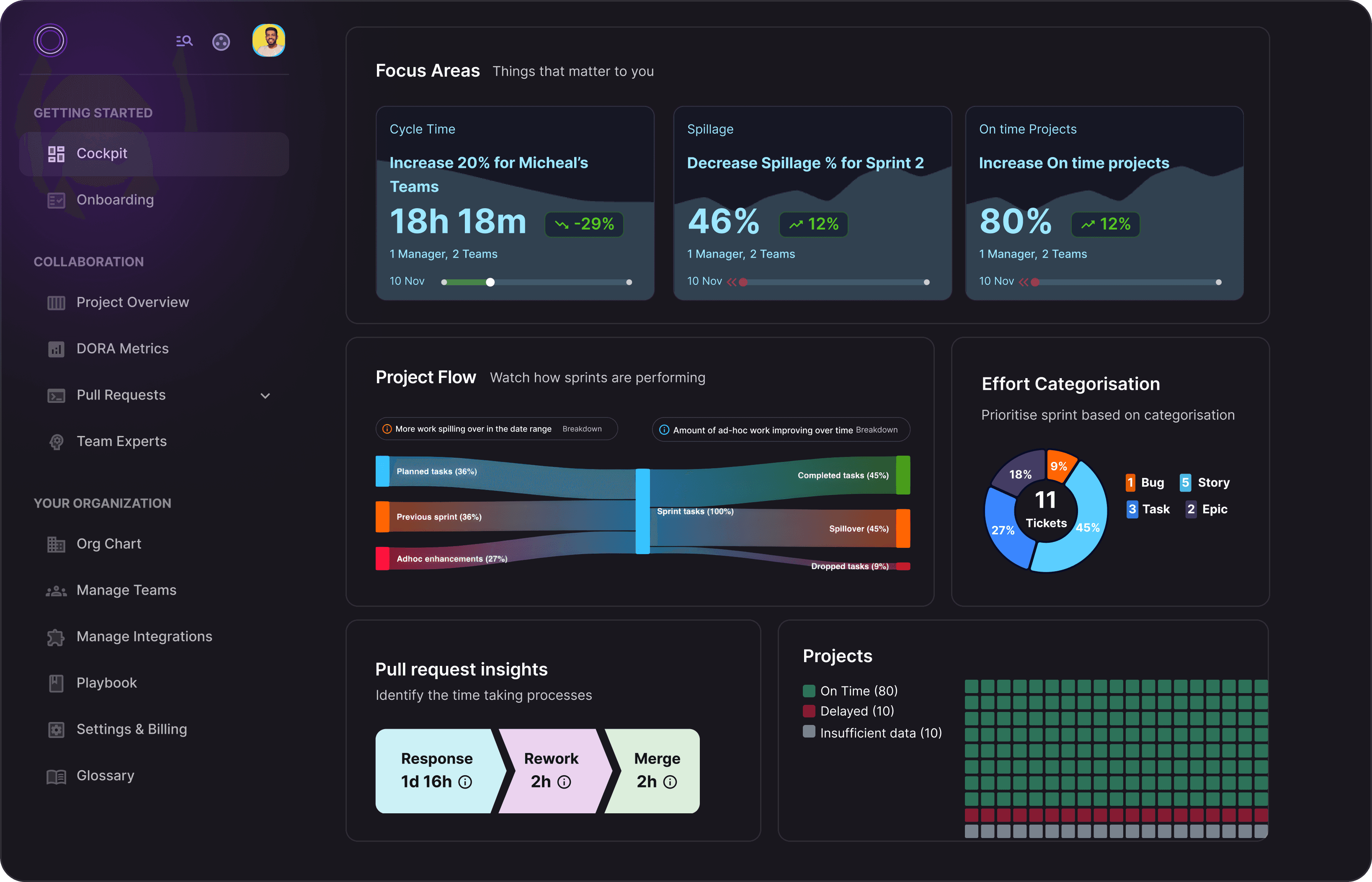 Automated sprint and delivery reports, trend views over time & AI-generated summaries that help you understand what’s improving, what’s not, and what to prioritize next every step of the way.